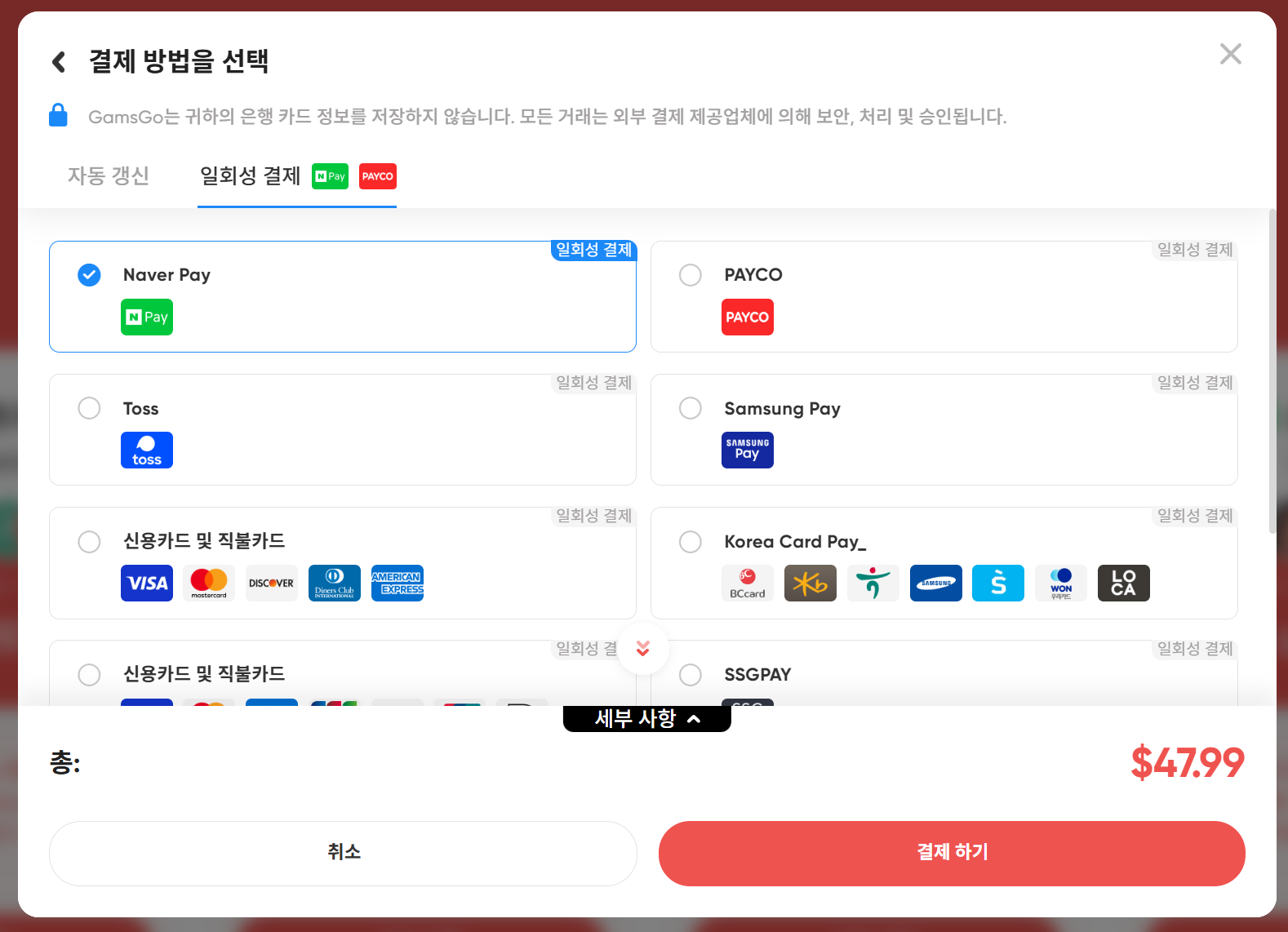 네이버페이, 삼성페이, 카카오페이 등 다양한 간편결제를 지원해 빠르고 편하게 결제할 수 있습니다. 저는 네이버페이로 결제했는데 빠르게 처리되어 좋았어요!