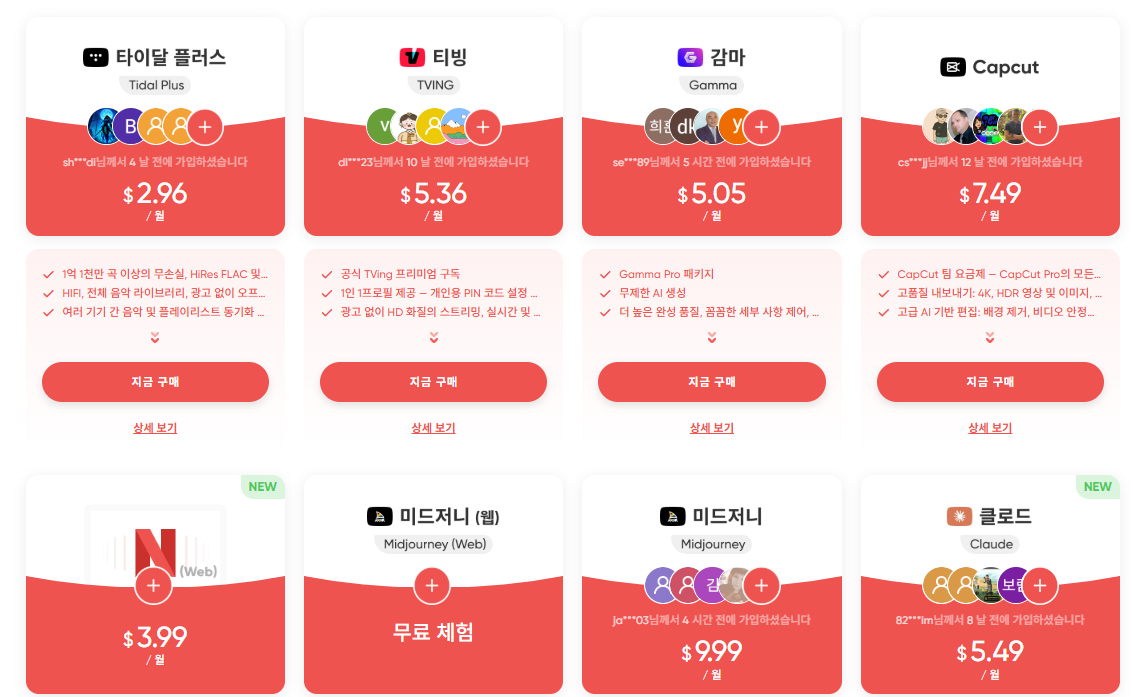 많은 OTT 공유 서비스가 존재하지만, 실제 사용 후기나 편리한 구독 관리 기능을 고려했을 때 겜스고가 가장 만족스러웠습니다. 챗GPT, 넷플릭스, 디즈니 플러스, 티빙 등 자주 사용하는 서비스도 다양해 선택의 폭이 넓다는 점도 장점이에요.
