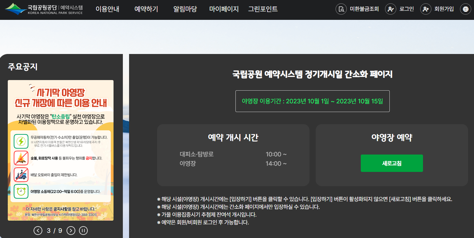 국립공원 예약시스템 정기개시일 간소화 페이지 야영장 이용기간 : 2023년 10월 1일 ~ 2023년 10월 15일 예약 개시 시간 대피소·탐방로 10:00 ~ 야영장 14:00 ~ 야영장 예약 새로고침 ※ 해당 시설(야영장