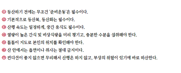 등산하기 전에는 늘 예기치 못한 상황을 대비하여 항상 5분간 준비운동을 하는 것을 강력하게 권장한다.