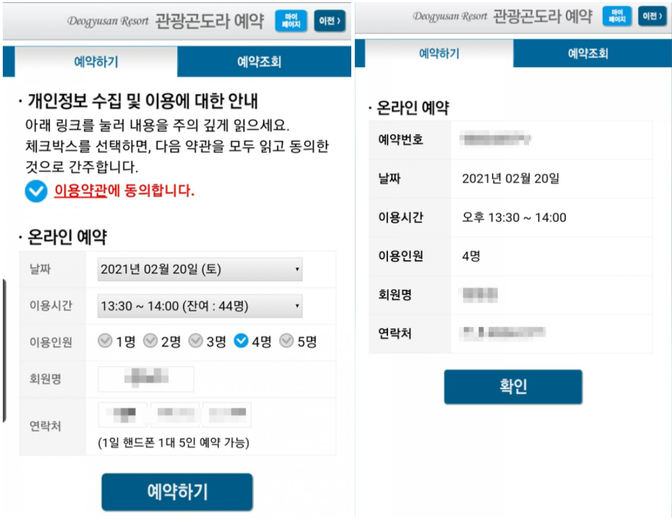 이용 정보를 기입한 후 예약하기 버튼을 누르면 예약 완료 화면이 나옵니다.