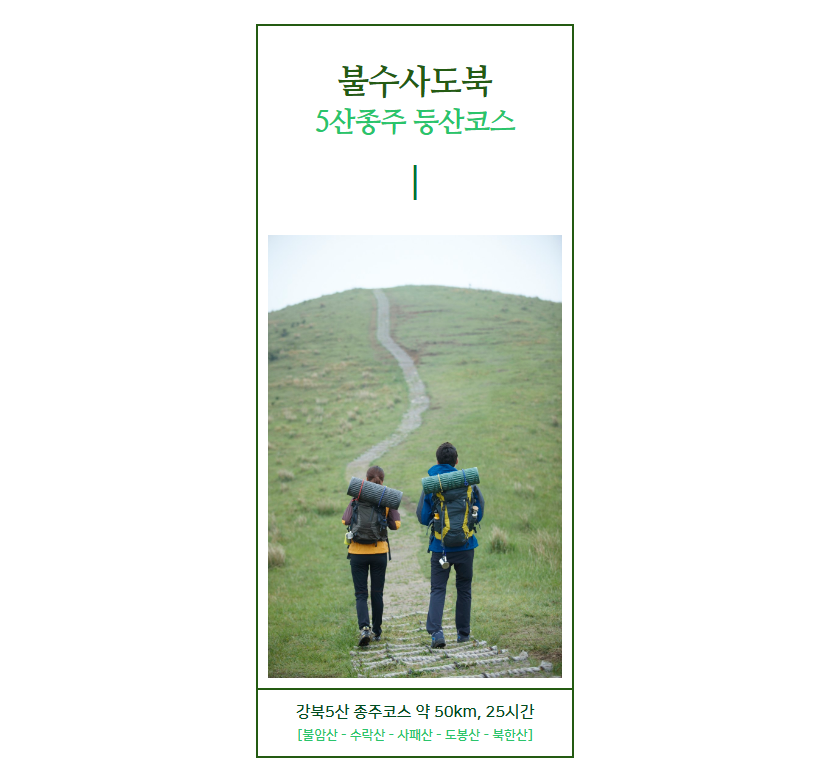 강북5산이라고 불리는 불암산, 수락산, 사패산, 도봉산, 북한산은 각자 산 이름의 앞글자를 따서 '불수사도북 종주코스'로도 유명한데요. 등산 고수가 하루 종일 산행을 해도 거의 불가능할 정도로 힘든 종주코스로 블랙야크(BAC) 불수사도북 종주의 23개의 뱃지를 획득하기 위해 도전하는 분이 늘고있습니다. 간혹 1박 2일로 강북5산 종주를 하는 분도 봤는데, 넘사벽의 실력이고 평균적으로 4박 5일 혹은 5박 6일의 여유로운 기간을 잡고 강북5산 등산코스 종주를 하는 경우가 대부분입니다.약 50KM로 한번도 쉬지 않고 운동 시간만 기록하면 하루를 넘길 정도로 빡센 코스입니다.