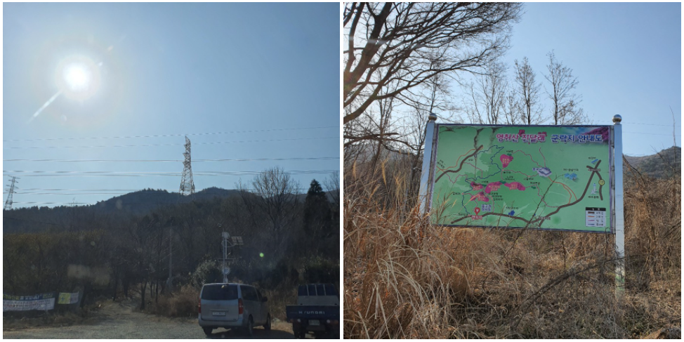 영취산 초입에는 간소한 등산안내도와 입구에는 바리케이드가 설치되어 있는데요.