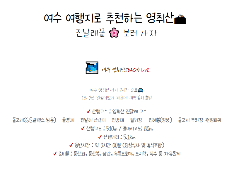 봄이 되니 여수 진달래 축제를 즐기려 영취산 등산코스를 검색해보는 분들이 많으실텐데요.