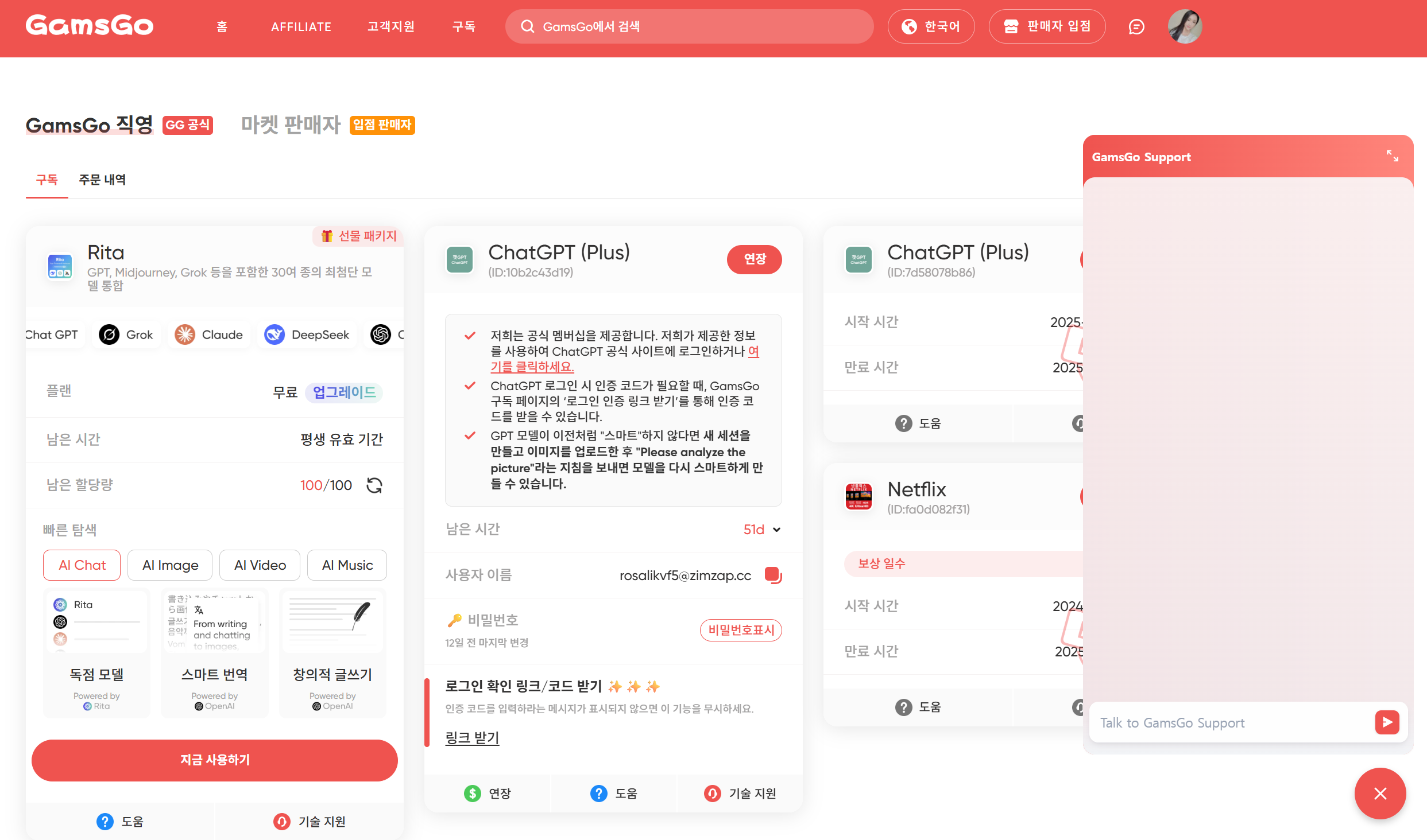 구독 정보 확인도 편리했어요. 겜스고 홈페이지의 ‘구독’ 메뉴에서 남은 기간과 만료일을 바로 확인할 수 있어 관리가 어렵지 않았습니다. 중도 환불이 필요해 채팅으로 문의한 적이 있었는데, 응답이 빠르고 절차도 복잡하지 않아 바로 처리되더라고요. 온라인 채팅으로 상담이 가능하다는 점도 신뢰감을 주는 요소였어요.