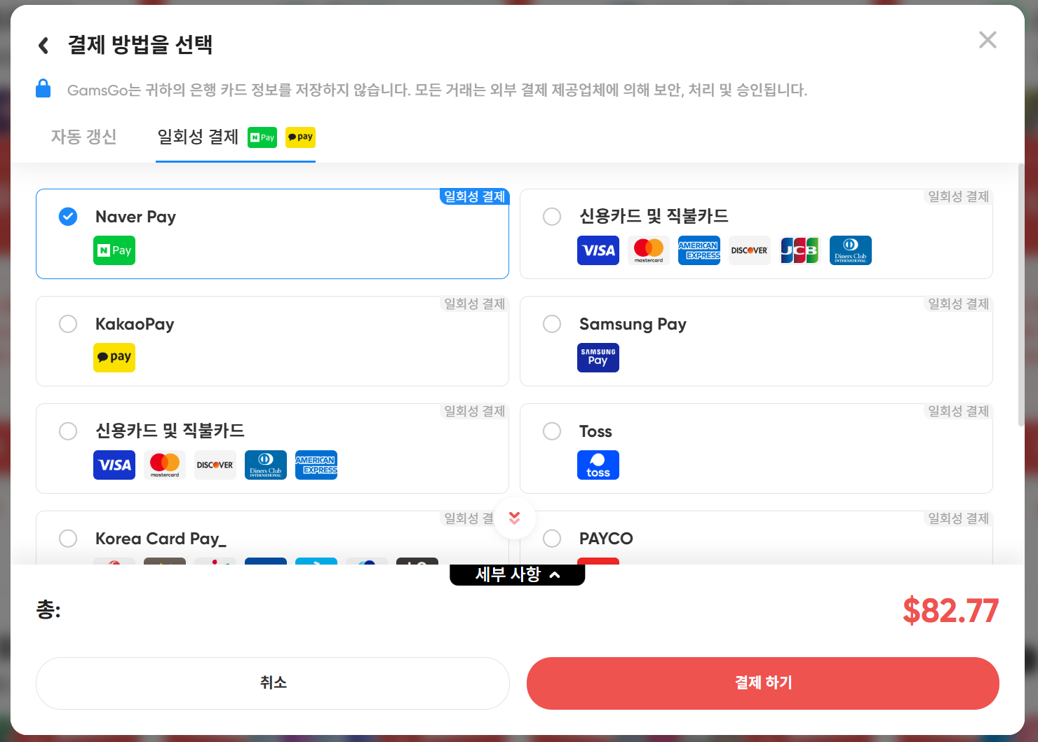 할인코드(BMQAJ) 적용까지 마쳤다면, 마지막으로 원하는 결제 수단을 선택해 결제를 진행하면 됩니다. 네이버페이, 삼성페이 등 많은 분들이 익숙하게 사용하는 결제 방식도 지원돼서 사용하기 매우 편리했어요.