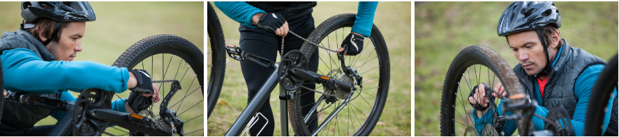 체인이 빠진 경우, 우선 자전거를 거꾸로 세워 바퀴가 바닥에서 벗어나게 합니다.