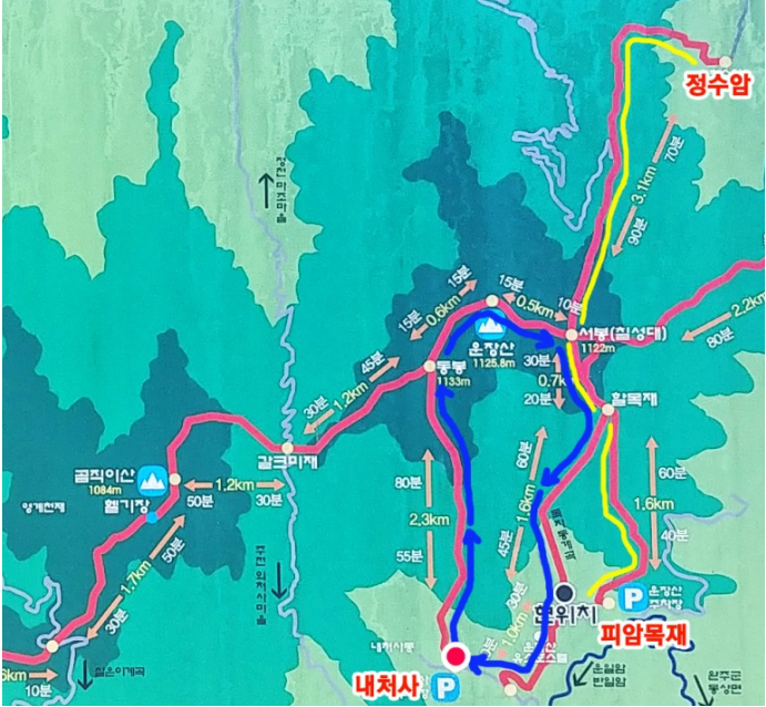 내처사 주차장 입구 - 동봉(삼장봉) - 정상 - 서봉(칠성봉) - 할목재 - 내처사 주차장 원점회귀
