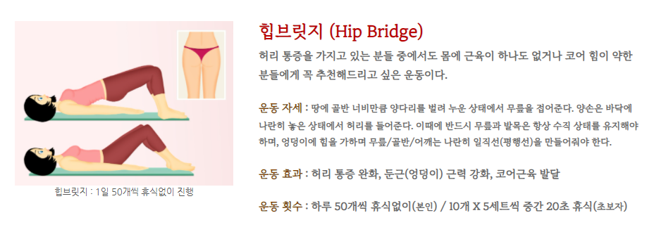 허리 디스크나 평소 요통을 앓고 있는 분들에게 추천하고 싶은 힙 브릿지는 코어 근육 단련에 효과적인 운동이고 힙업 효과가 있어 예쁜 엉덩이를 만들어 준답니다. 주의해야 할 점은 무릎이 벌어지지 않게 주의해야 하며 무릎과 발목은 90도에 가까운 수직 상태를 유지해줘야 합니다. 또한 무릎 - 골반 - 어깨는 평행선을 만들어 몸통이 움직이지 않게 유의해줍니다.