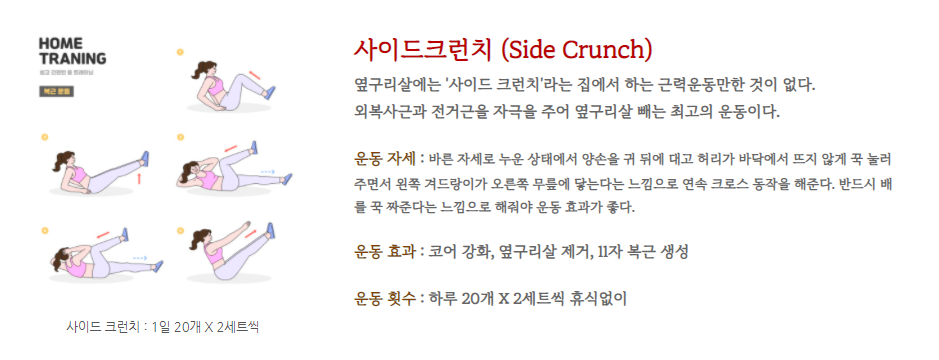 집에서 하는 근육운동 중에서도 옆구리살 빼는 운동으로 효과적인 사이드 크런치는 외복사근과 전거근에 자극을 주면서 복근을 키울 수 있는 운동입니다. 주의해야 할 점은 사이드 크런치를 할 때에는 무조건 복근에 의도적으로 힘을 준 상태에서 해야 운동 효과가 좋다는 것입니다.