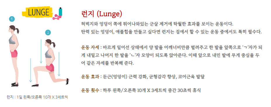 런지는 예쁜 엉덩이를 만들 수 있는 운동으로 허리나 허벅지 바깥쪽 군살 제거하는 데에 효과적인 자세인데요. 주의해야 할 점은 허벅지가 앞뒤로 움직이지 않게 자세 고정된 상태에서 운동하는 것이 중요하고 반드시 앞으로 내민 발 쪽에 무게 중심을 두고 운동해야 합니다.