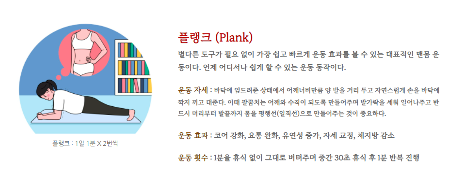 별다른 운동 기구 없이도 집에서 쉽게 할 수 있는 대표적인 근육운동인 플랭크는 언제 어디서나 쉽게 할 수 있다는 점이 장점인 것 같아요. 처음 하는 분들은 30초도 버티기 힘들지만 꾸준히 하다 보면 30초에서 1분, 1분에서 2분, 2분에서 5분까지 거뜬하게 버틸 수 있게 코어 근육 발달을 시켜주기도 하며 체력 증진의 효과도 있습니다. 주의해야 할 점은 팔꿈치는 구부리지 않고 어깨와 수직이 되도록 자세를 유지해주면서 발가락 끝을 세워서 머리부터 발끝까지 일직선으로 버텨줘야 합니다.