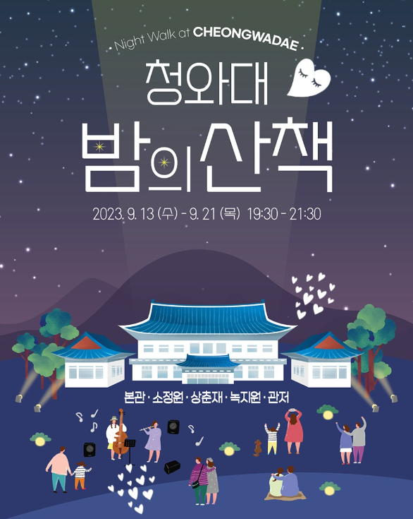 청와대 밤의 산책이라고 불리는 청와대 야간개장은 올해 고궁 야간개장에 이어서 청와대에서 멋진 밤을 보낼 수 있는 특별한 이벤트인데요. 청와대는 대한민국의 대통령 공관으로, 특별한 날에 한하여 일반인들에게 개방됩니다. 이 중에서도 야간개장은 청와대의 아름다운 야경을 감상할 수 있는 특별한 기회를 제공합니다. 서울 데이트 명소를 찾는 분들에게는 더할 나위 없는 빅이벤트가 될 거라 확신합니다. 청와대 야간개방은 23년 9월 13일부터 9월 21일까지 진행되는 행사고 무료입장으로 야간개장 관람이 가능하기 때문에 관심 있는 분들은 꼭 놓치지 말고 다녀오시길 바랍니다. 단, 9월 19일 화요일은 휴관이라고 하니 참고하시길 바라며 관람 시간은 오후 7시 30분부터 오후 9시 30분까지이며 2시간가량 청와대 야간 개방으로 관람이 가능합니다. 입장 또한 내부 관람까지 오후 9시에 마감되오니 착오 없이 입장하시면 좋을 것 같습니다.