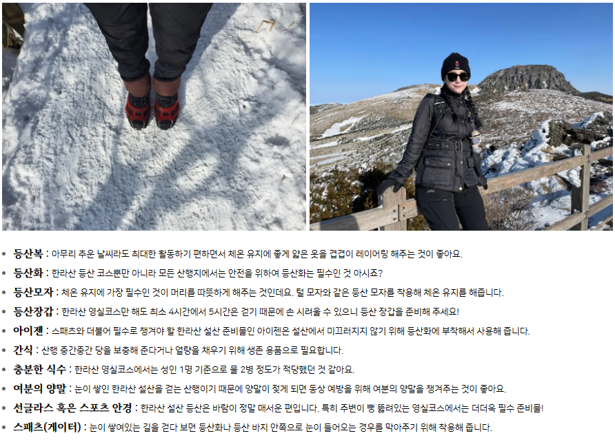 한라산 등산 준비물, 여성 등산자켓이나 등산바지, 등산화 그리고 등산 아이젠, 등산장갑까지 제가 착용한 제품들을 공유해 드리니 정보가 궁금하신 분들도 참고하셨으면 좋겠어요. 또한 한라산 영실코스 등산 하시는 분들이 꼭 놓치지 않으셨으면 하는 거린사슴 전망대! 한라산의 위엄을 한눈에 느낄 수 있으니 꼭 들렀다 오시는 것을 추천합니다!