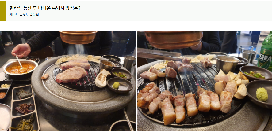 등산 후에는 무조건 고기 보충을 해줘야 하는 암묵적인 우리만의 룰, 제주도 서귀포에 위치한 숙성도 중문점에 다녀왔어요. 워낙에 흑돼지 삼겹살로 유명한 맛집이라 한번 꼭 방문해보고 싶었는데 정말 맛있긴 하더라고요.