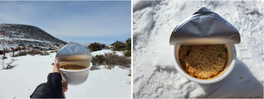 등산하기 전에 미리 숙소에서 챙겨 나온 컵라면과 보온병, 김밥 두 줄을 허겁지겁 해치웠습니다.