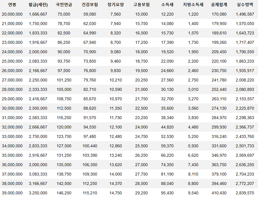 연봉 2천만 원 ~ 3천9백만원 세후 월급