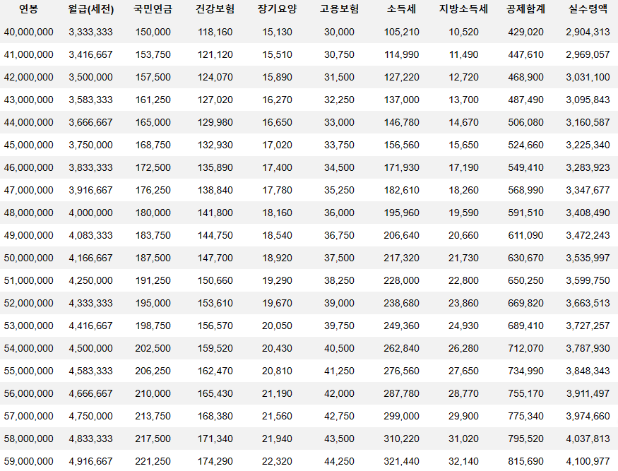 연봉 4천만원 ~ 5천9백만원 세후 월급